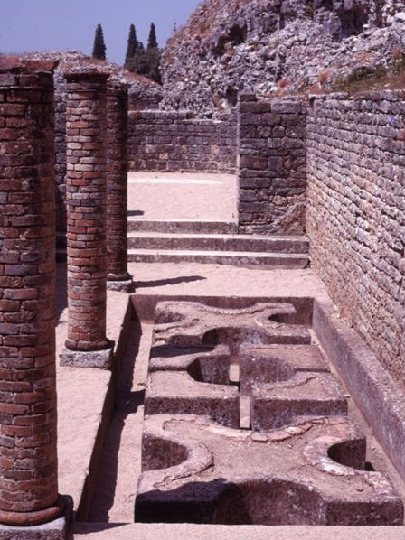 South of the central peristyle was a large room that centered on the garden, and on the east side of it a large doorway opened open on a large pool with eight columns around the eastern half of the pool. Along the sides were masonry planters projecting a foot or so into the pool. They must certainly have been filled with earth where plants or flowers must have been grown. The boxes covered in pink mortar are clearly visible in the foreground in Figure 3. Traces of plinths in the spaces between the columns suggest that there may have been small statuettes there.