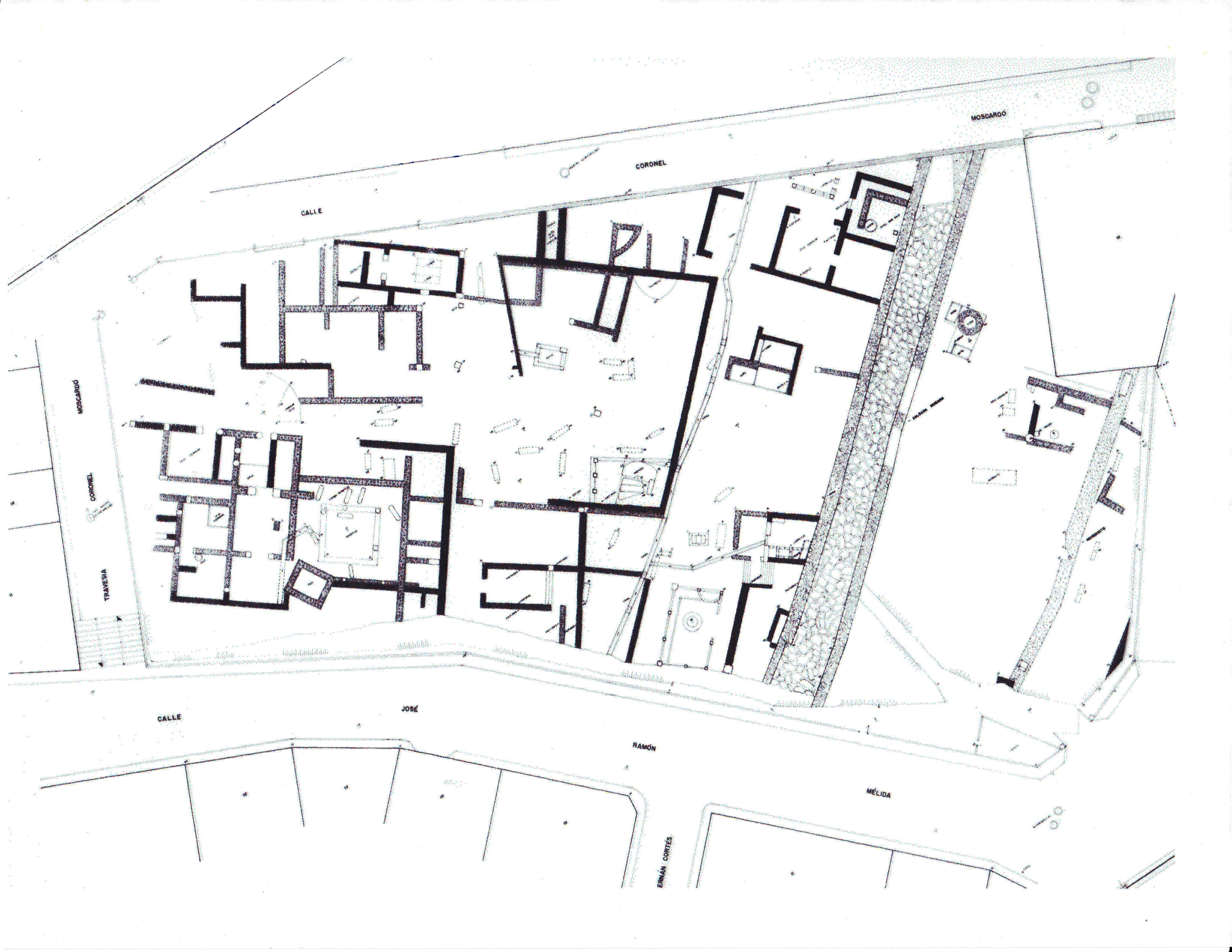 Prior to building the present Museo Nacional de Arte Romano, excavations were undertaken at the site in 1978 and 1979. Two suburban residences were explored and preserved in the crypt of the museum. These contained at least three courtyards. One was a colonnaded courtyard of 'marble,' and this small rectangular courtyard (at the rear of the crypt) consisted of a low wall of mortared rubble with simple marble columns of the Tuscan order. It was surrounded by incompletely excavated chambers, one of which had a program of wall paintings and stuccos which dated the complex to the period first through the fourth century A.D.