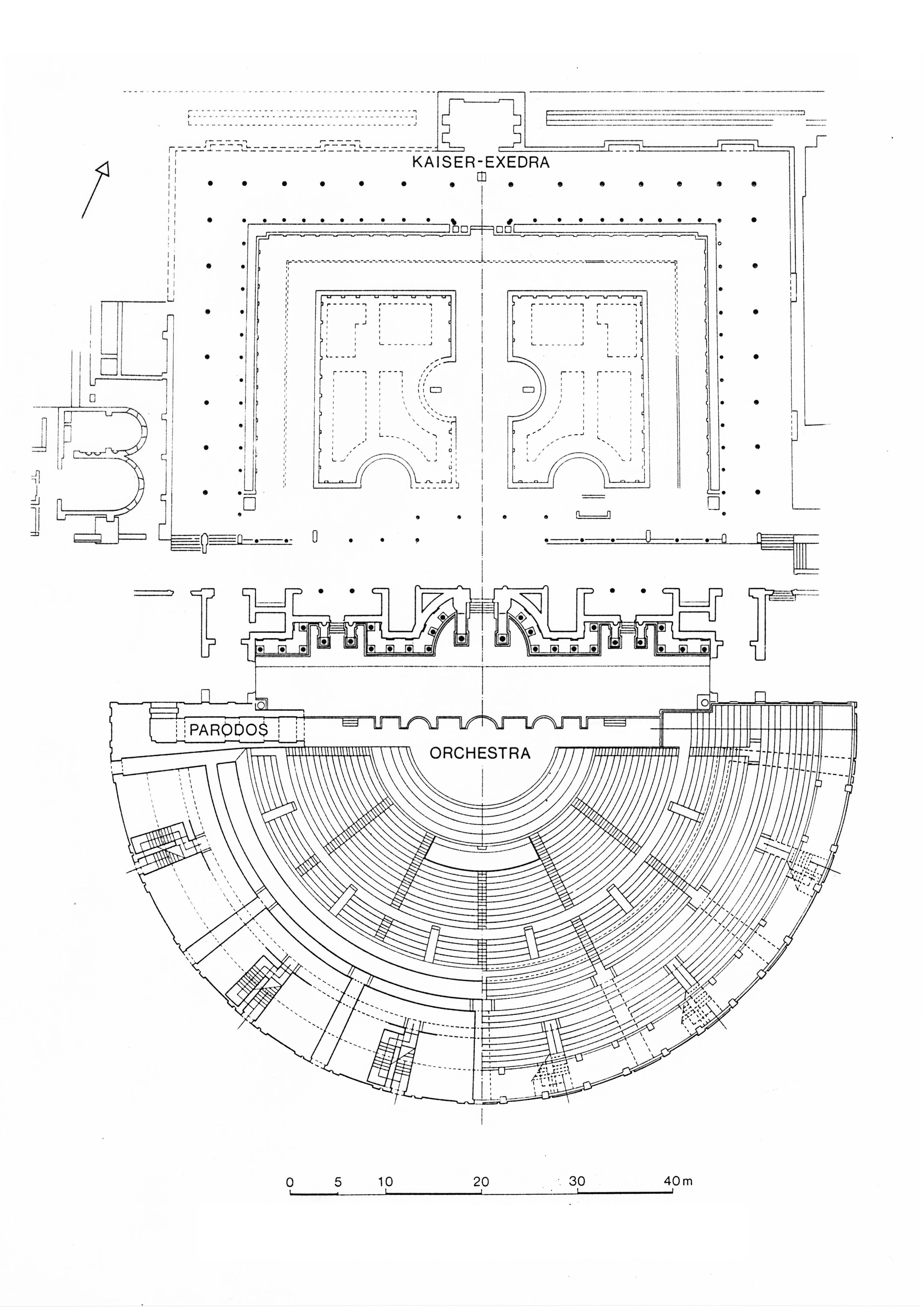 A water channel bordered the exterior of the colonnade, emptying into two small square depressions in the northeast and northwest corners which connected to the drains traversing the north side of the peristyle. Water, indispensable for irrigation and the fountains, was in ample supply, probably owing to the theate's proximity to the San Lázaro water canal. Parallel to the portico of the rear of the proscenium (stage), in the eastern part, ran a wall which expanded in the form of an exedra, forming a semicircular space for a statue. But the most interesting element of the peristyle, located at the back of it and on axis with the valva regia, was an aula sacar locate on plan, dedicated to the imperial cult. In front of this was a small marble fountain decorated with vegetal motifs. The aula sacra consisted of a small rectangular chamber with marble revetted walls and niches for statues. Inside, four toga-clad statues, a veiled head of Augustus, and a head of Tiberius were found.