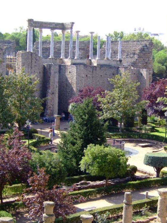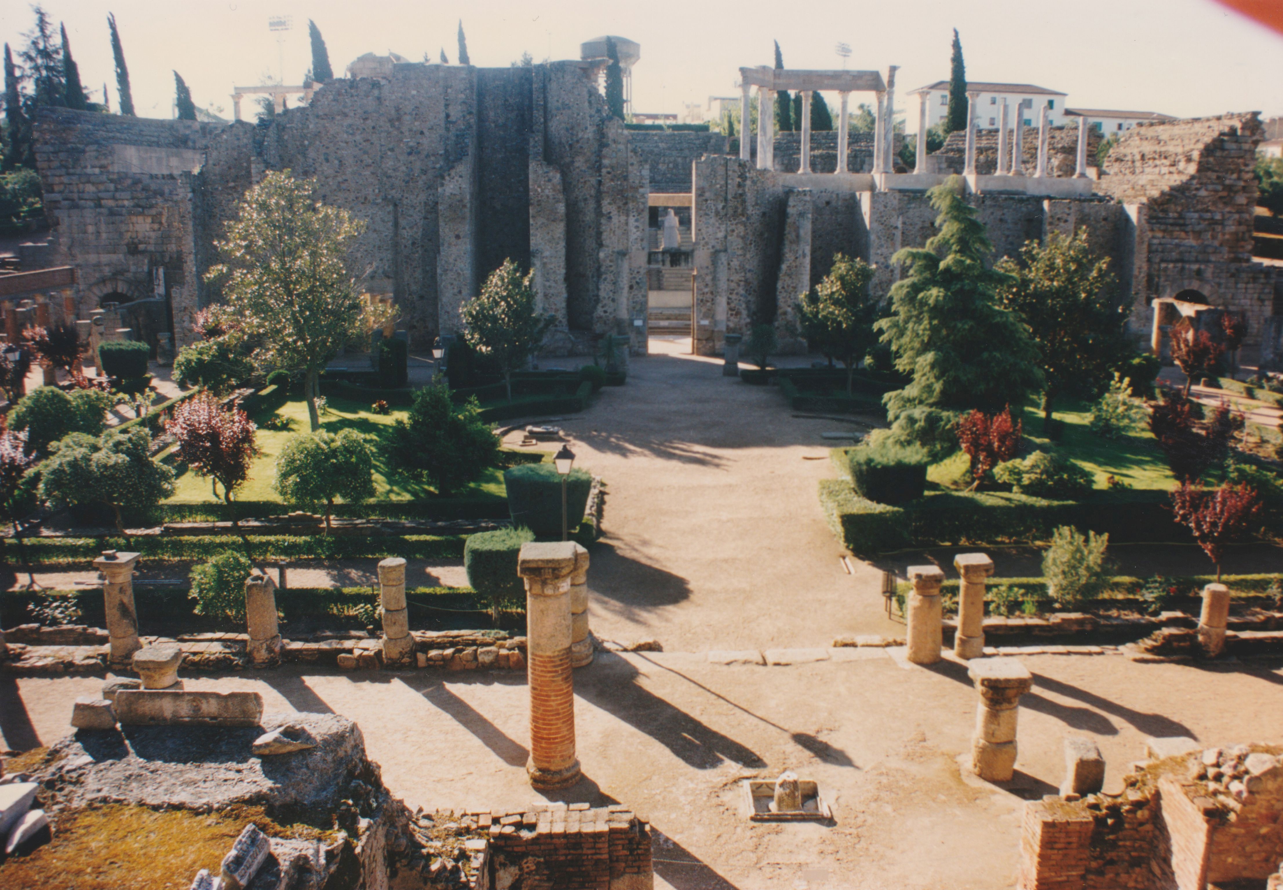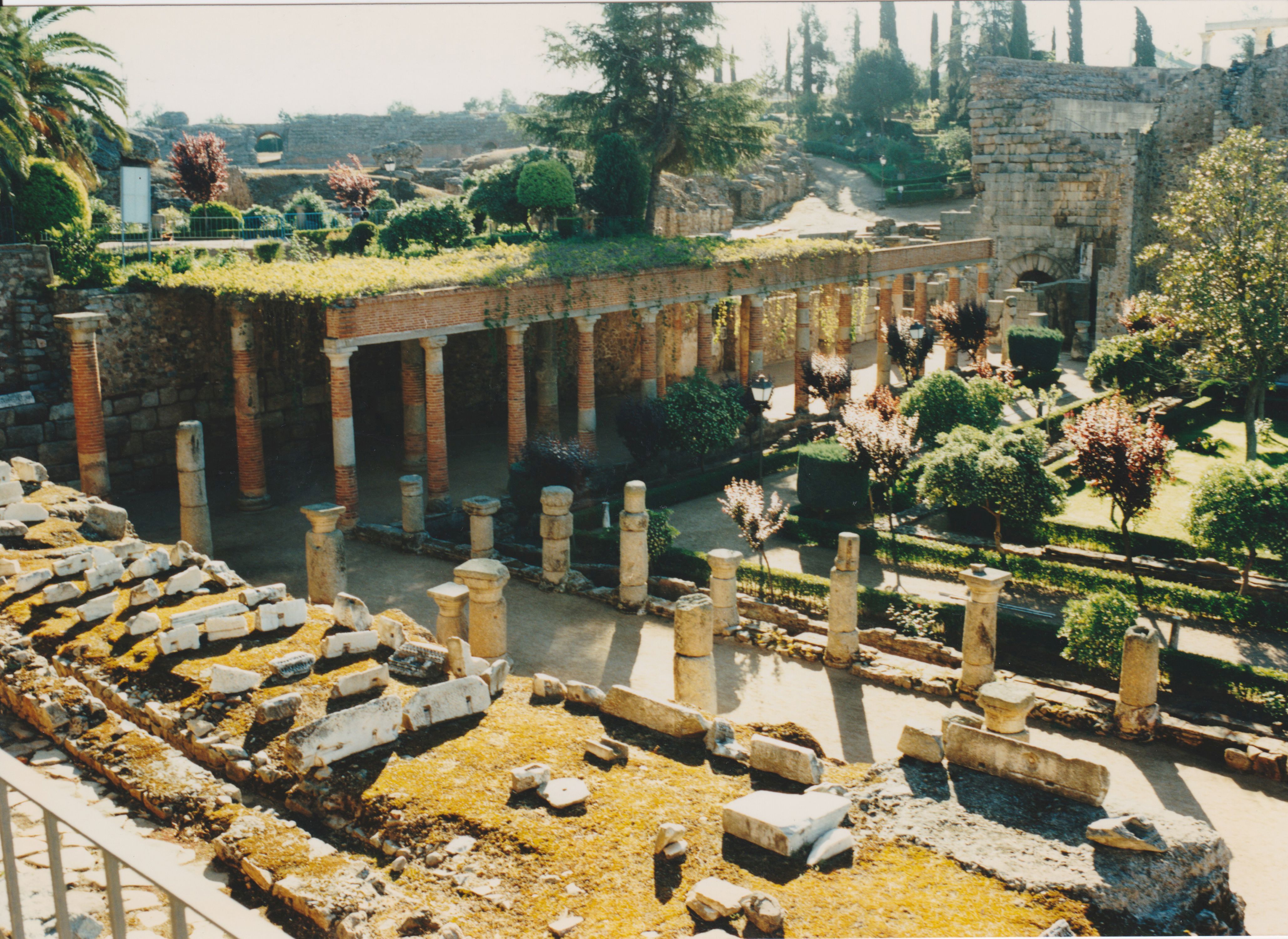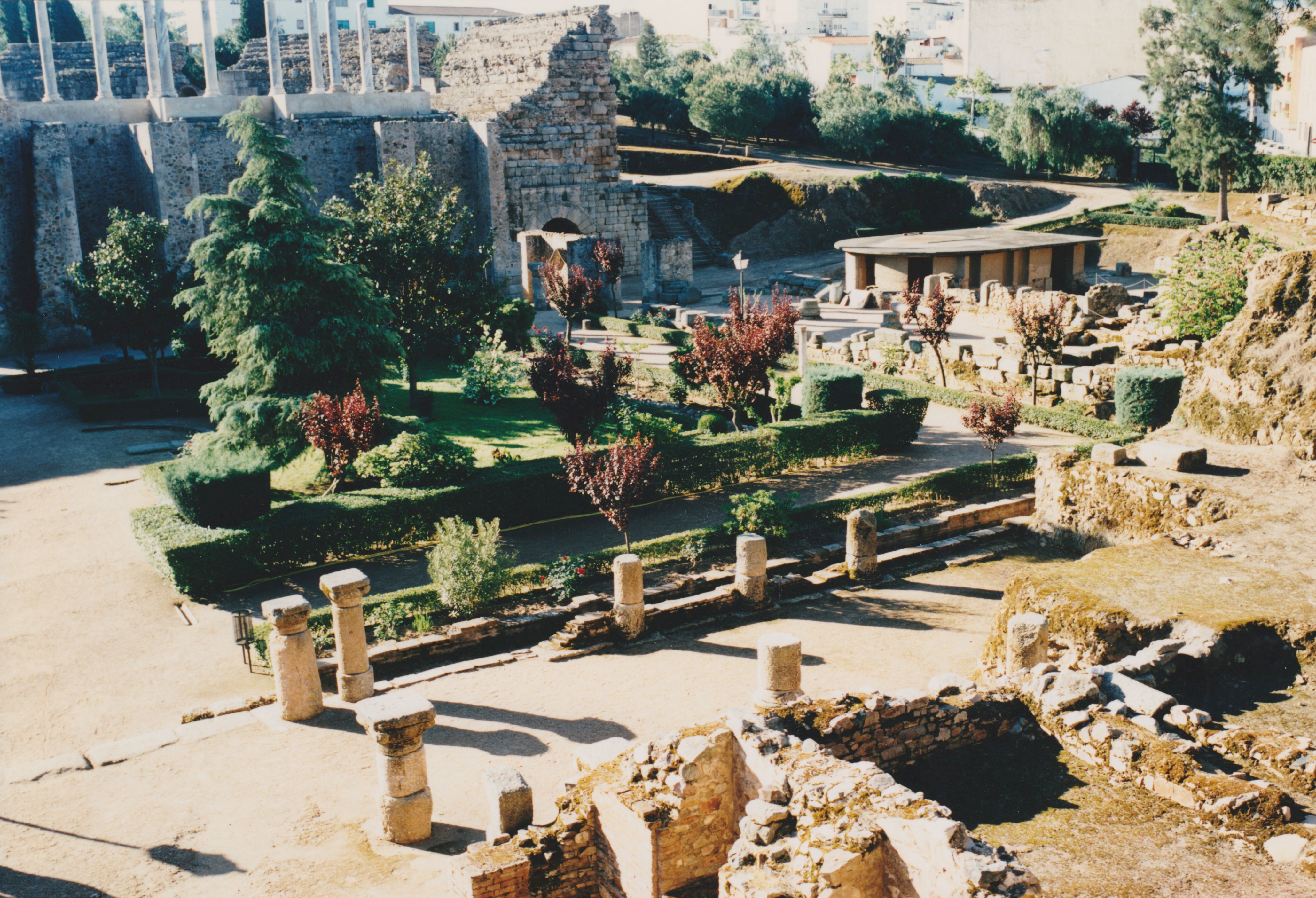 The space behind the theater screen comprises one of the best preserved gardens of Augusta Emerita. It consisted of a rectangular enclosure surrounded on the north, east, and west sides by ambulatories formed by double colonnades of granite with Corinthian capitals and red-stuccoed bases. The wall within these walkways had niches with paintings, of which few traces remain. In addition to entering through the screen, access was also possible via a small flight of granite steps in the southeast corner from the street, which separated this monument from the Amphitheater.