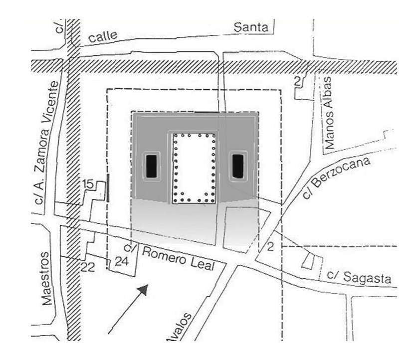 The Temple of Diana is the only surviving religious building from the Augusta Emerita Forum. Despite its name, it was actually dedicated to the imperial cult and dates to the end of the Augustan period. Excavations conducted in 1972 by J. Mª. Álvarez Martínez produced some evidence for a garden in conjunction with the temple. The space surrounding the temple was interpreted as a garden area, enclosed by a portico, which contained two rectangular pools on the east and west sides of the temple. Of the sculptural pieces found outside the temple, some have been situated in the western pool: a bronze leg (forming part of an idealized figure and probably fixed on the base of the pool) and two marble fragments of tragic masks which could have served as fountain spouts.
