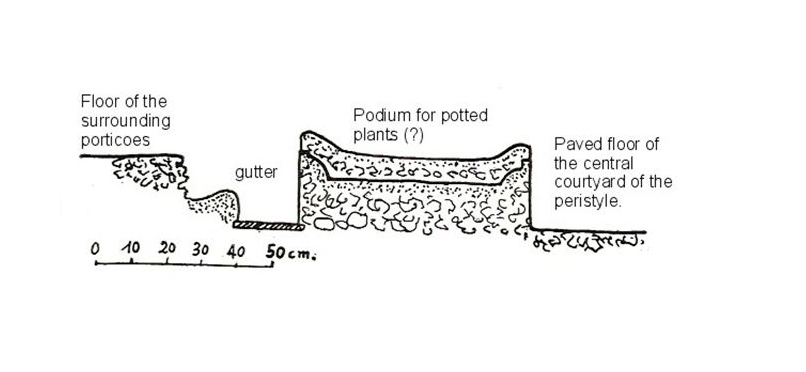 The villa had a peristyle courtyard, (13 x 17 m), but as found, it was paved with a floor of crushed bricks embedded in concrete. It was not, however, necessarily always paved. Serra Ráfols felt that the original villa went back to the middle of the first century A.D, and that it was considerably amplified and given some mosaic floors in the middle of the second century A.D. Then later came proprietors "who felt a veritable passion for rustic pavements of crushed brick in concrete, which they put down everywhere" (p. 162). Previously, the inner court of the peristyle had presumably been a garden. The paved floor of the peristyle is some 18 centimeters below the level of the surrounding galleries. Around the perimeter of the central court, some 35 cm from the edge of the galleries, they built a wall about 30 cm high and 65 cm wide. The top of the wall was mostly flat but at the edges it had upward slanting lips that made of the whole a sort of shallow trough. It was too shallow to be for ornamental water, so Serra Ráfols conjectured that it was a sort of podium for potted plants. It would have elevated the plants somewhat and caught any excess of water given them. Indeed, it might have been especially nice for potted flowers, for it would bring their blossoms closer to eye level and also allow for frequent changes in order always to have plants in bloom. This structure is intact at the northwest corner of the peristyle (Fig. 2).