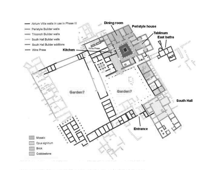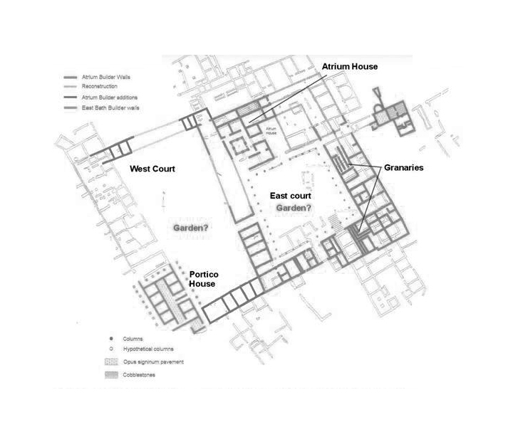 In Phase 2 (Fig. 2), from the end of the first century to mid-second century A.D., an atrium-based house was constructed and, south of it, a large peristyle courtyard. Though the atrium was unusually large with six columns rather than four -- what Vitruvius called a 'Corinthian' atrium -- it seems unlikely to have been gardened. The peristyle courtyard to the south, marked East Court in Figure 2, is a much more probable area, not for a formal garden but for the kind of informal garden. The entrance to the house was from the south through this peristyle. To the west was an even larger courtyard but without a peristyle. The rooms around it were modest homes with hearths and an occasional half-buried dolium. The central area may have been more farmyard than garden but quite likely had some vegetables. The "Portico House" on the southeast corner is noteworthy for its "modern" design with the porches around the house rather than the house around the porches. The central hall may have been open to serve as a light well.