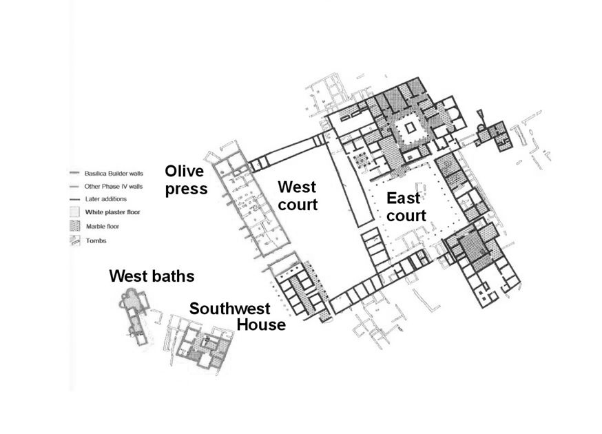 There is one space which was likely gardened as well as several other likely spots. The report of the University of Louisville team distinguishes a number of phases. The relative chronology is based largely on the identification of the building techniques of successive master masons, while absolute dates are determined from ceramics and embedded coins found during excavations in the 1980s. The first phase consists mainly of finds of ceramics and coins from the middle of the first century A.D. but includes also the little two-room structure in the East court.