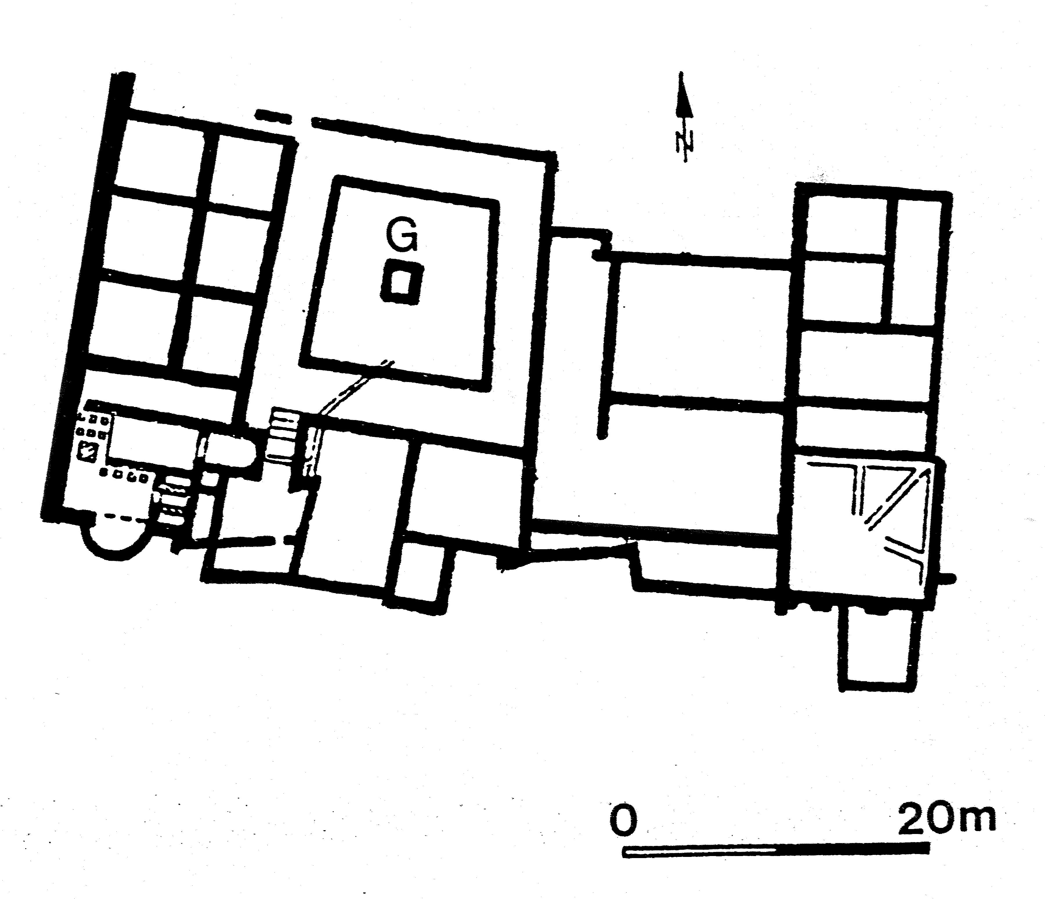 Very few houses of Mediterranean type have been discovered, and only one can be said with certainty to have had a garden (Fig. 1, G in Fig. 1). The peristyle courtyard was a prominent feature of this house of irregular plan and substantial size near the southern city wall. The house dates to the 3rd century, and it is thought to have been a clubhouse or schola for young men (collegium iuventutis), complete with a bath suite. In the middle of the courtyard, framed on four sides by a low wall supporting columns, was a square masonry pool (Fig. 2). In the center of the pool was a fountain consisting of a small marble satyr standing on a column of the same material. This decorative element and the unpaved ground strongly suggest the existence of a garden.