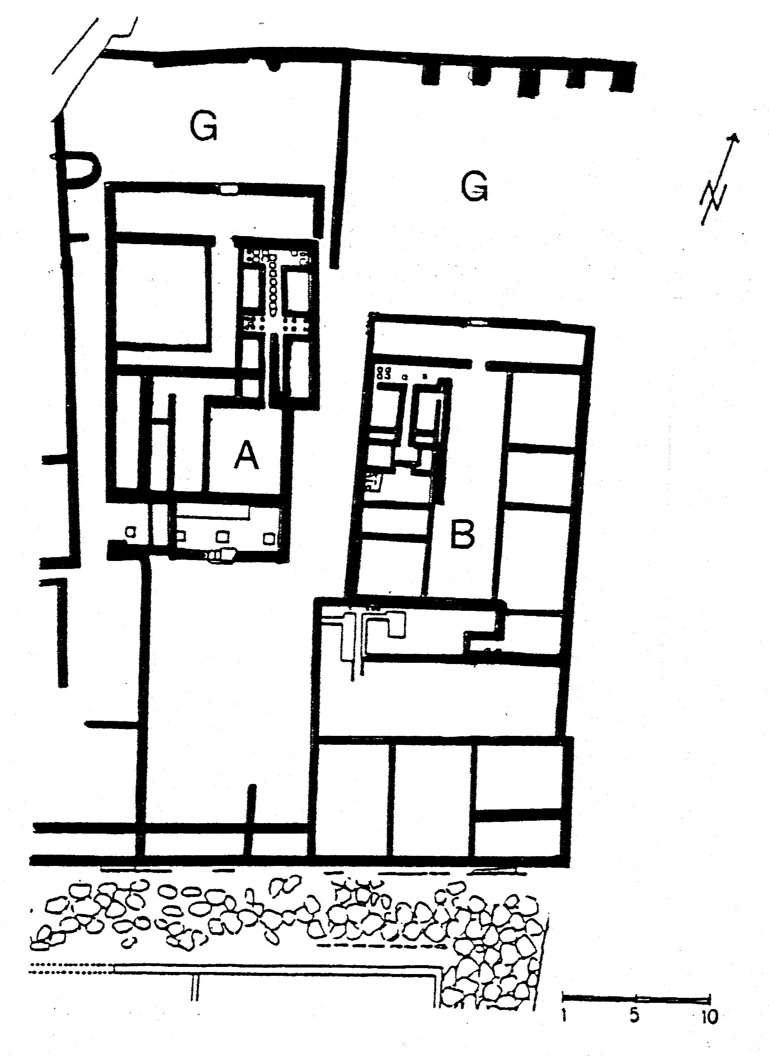 The regional house type found often in Pannonia, the so-called corridor house, is characterized by a vestibule or arcade on its narrow front and a central corridor running the length of the house, separating it into two parts. One of these houses (B on plan) on a street corner in Carnuntum exhibits this plan clearly (Fig. 1). South of the house, facing the street and separate from it, are various rooms which were interpreted as shops and workshops. North of the house is an open unpaved courtyard which is usually assumed to have been a garden, perhaps a kitchen garden (G on plan). The neighboring house (A in Fig. 1) to the east is of similar plan, if somewhat more irregular, and it too has an open courtyard at the north (G on plan).