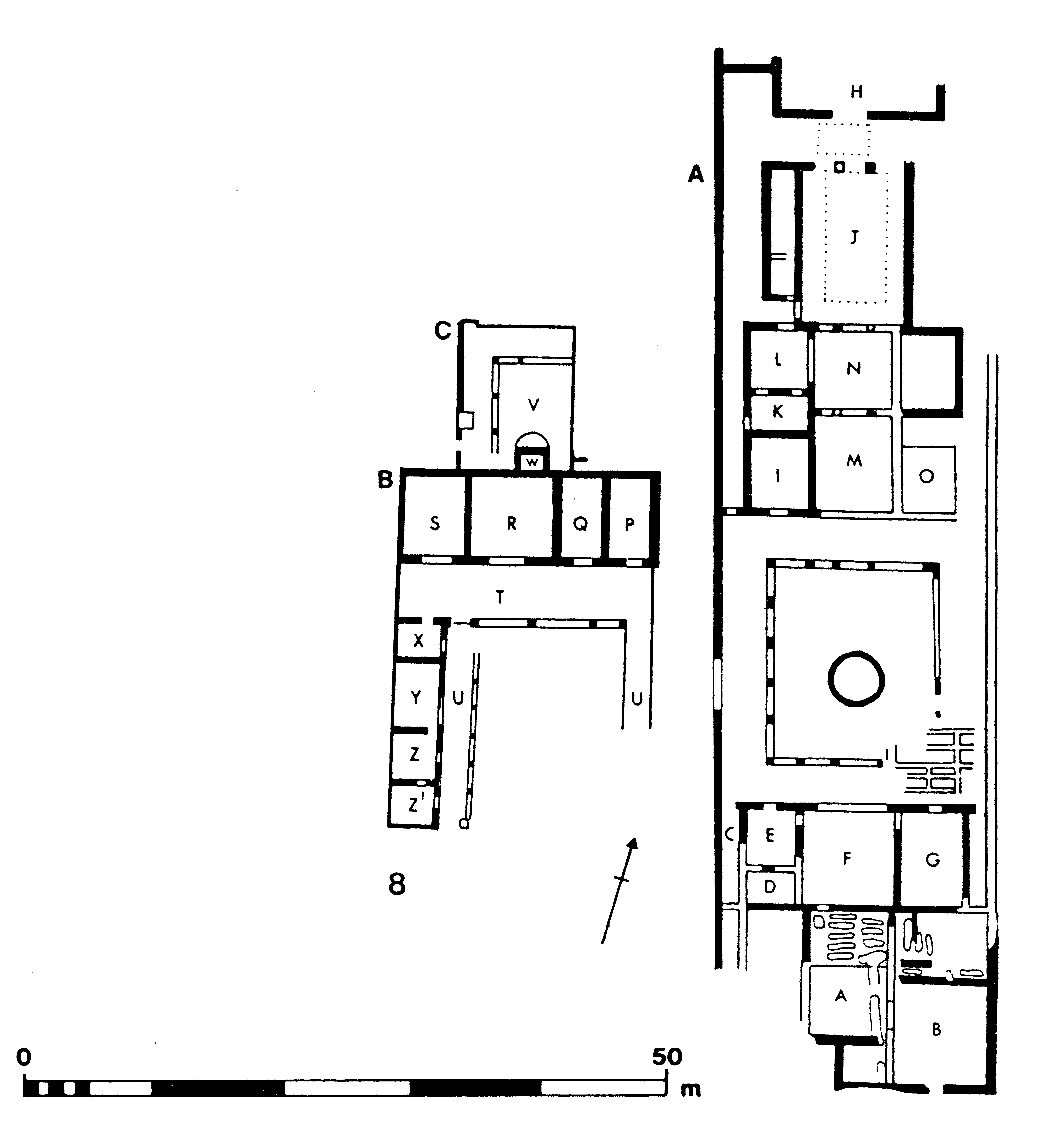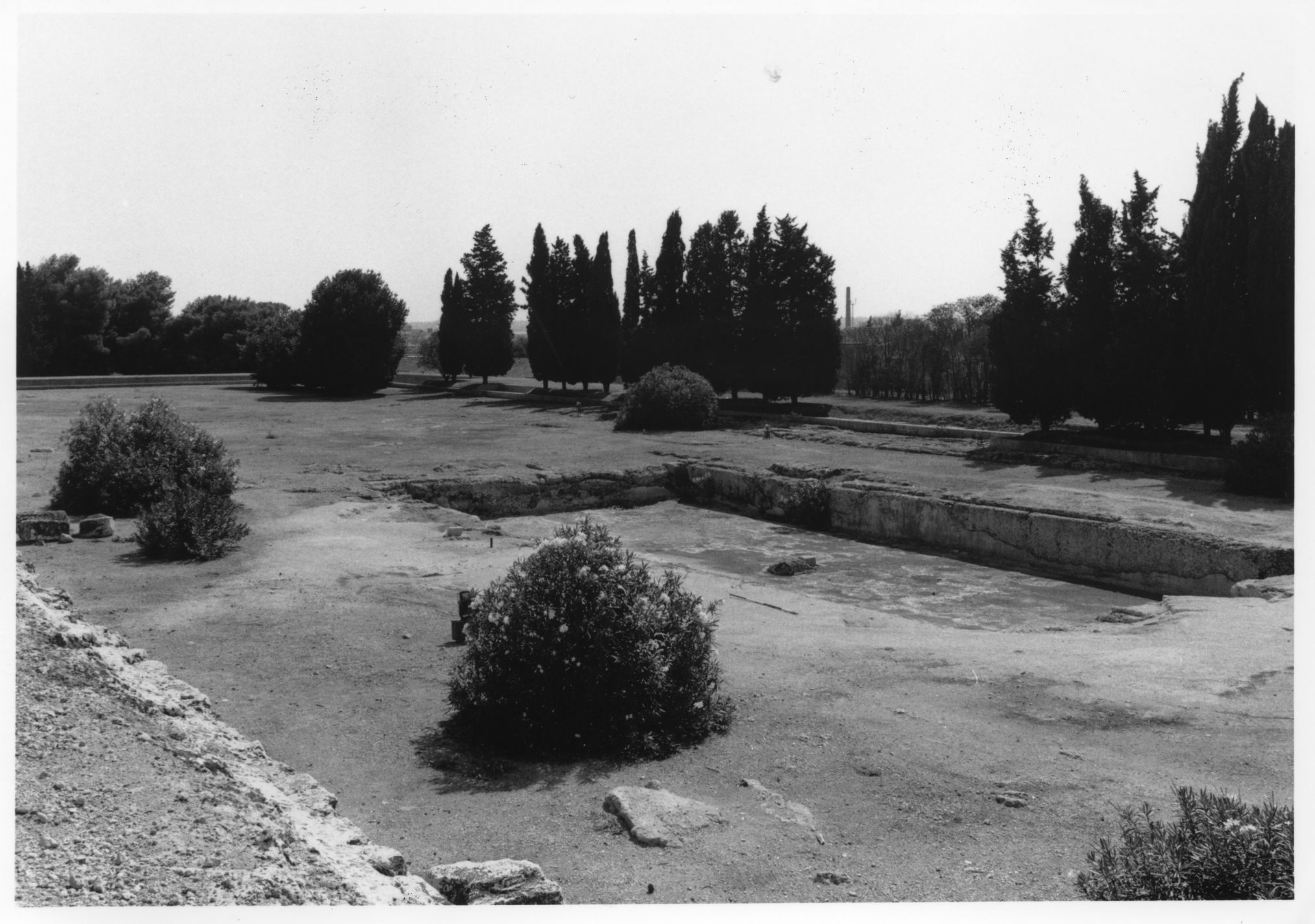 In the Roman period, the clearest evidence for the presence of a formal garden in a public place comes from Syracuse, where an impressive piazza, 175 by 45 meters, was laid out early in the Augustan period on the west side of the third-century B. C. Altar of Hieron (Fig. 2). A U-shaped stoa was erected on three sides, with fourteen columns on the short sides and sixty-four on the long; the Altar itself formed the fourth. Within the area enclosed by this portico, a large rectangular basin was erected in the center, with steps at the corners and a statue base in the middle; a drain led away from the basin westwards under the portico. The open space around the basin was planted systematically with five rows of trees, thirty-two trees in the two outermost rows, and twenty-six in each of the rows interrupted by the pool; there were thus 142 trees (of unknown species) in all (Fig. 3). The arrangement, with its central pool, trees and surrounding porticoes, recalls similar monuments in Campania, such as the Great Palaestra, also of Augustan date, at Pompeii (see Vol. 1, no.), and the Palaestra at Herculaneum (see Vol. 1, no.). The function of the Syracuse square is unknown, but it must have been principally intended as a pleasant park where the townsfolk of Syracuse could stroll, especially, perhaps, when attending events staged in the nearby amphitheater.