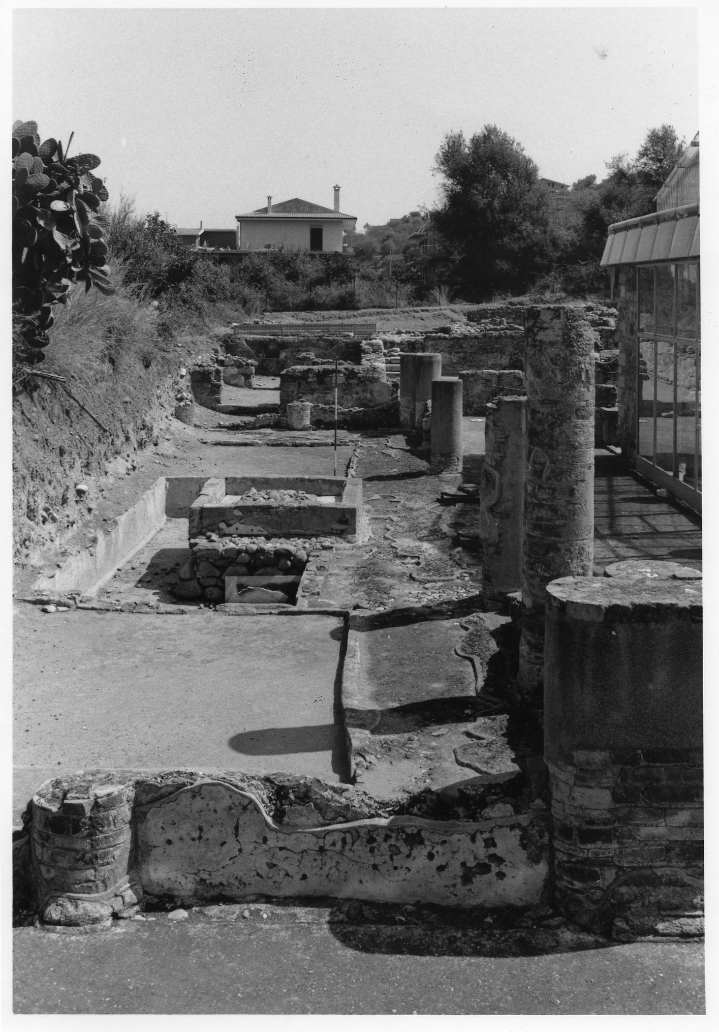 There is a four meter square basin located in the middle of the space enclosed by the peristyle (Fig. 6). Belonging to Farrar's type D, the pool has a square exterior and an inner outline of semicircular corner niches alternating with rectangular recesses. Probably belonging to the first half of the first century A. D., the pool is waterproofed with white mortar inside, and has edges lined with white and grey marble, possibly Carraran (Fig. 7).